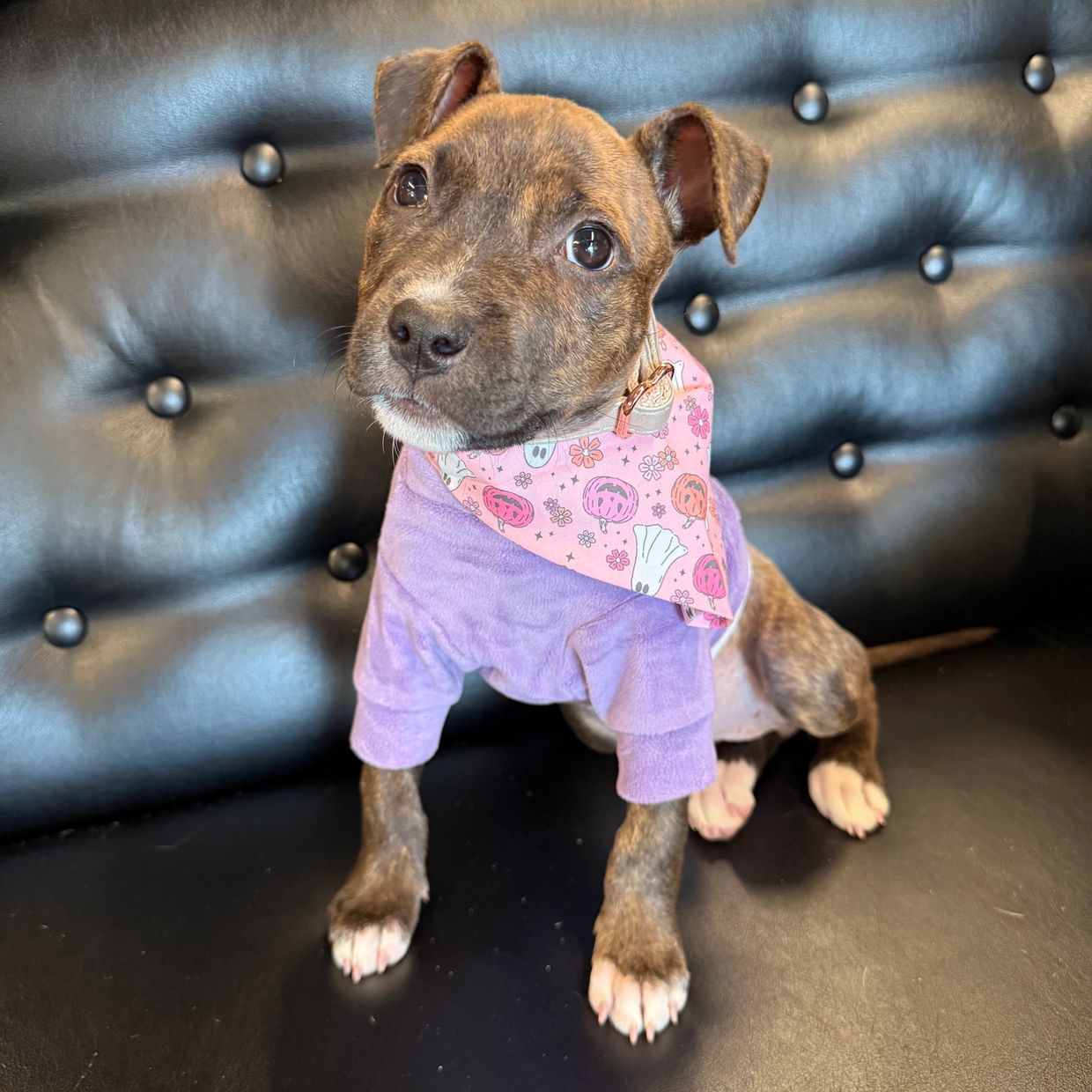 “She is verrryy playful and bouncy and loves being part of the pack—running down the hall for meals, excited to go outside. She’s also a great cuddler once she gets her zoomies out. She enjoys lounging on the couch or being pampered (obvs). She’s curious, always watching everything, though she can still get startled by new things. She’s learning her leash skills and still figuring out what’s okay to chew—and what’s not, haha.”